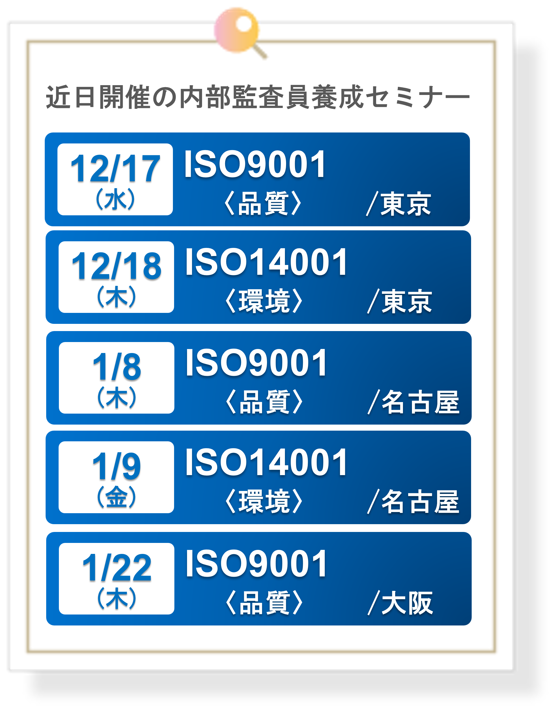 | 2025年12月17日(水) | ISO9001〈品質〉 | ASR本社セミナールーム | 申込み |