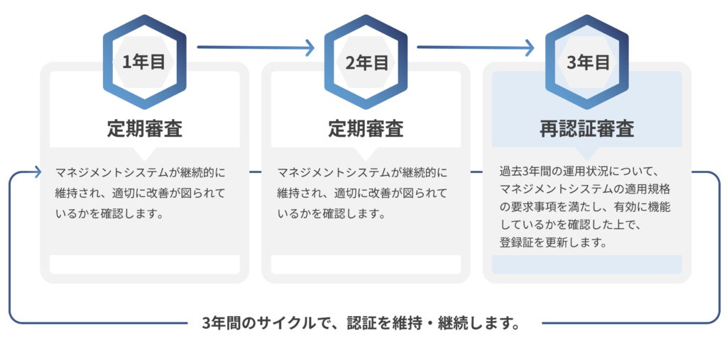 ※新規認証取得のお客様については、初回審査を基準年(0年目)として、次回の定期審査から、3年間のサイクルの運用が開始されます。
